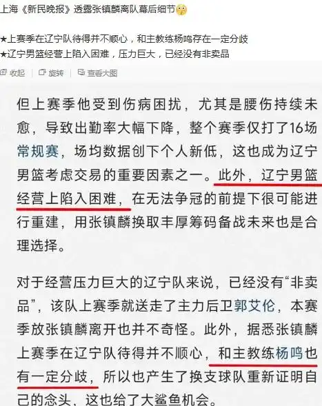 近期,沪媒《新民晚报》撰文谈到了张镇麟加盟上海一事,辽篮之所以考虑交易掉张镇麟,一方面是因为他上赛季饱受伤病困扰,数据大幅下滑;另一方面也是因为球队经营陷入困难,此前球队还进行过股权质押,所以用球员来换取转会费。此外,还有一个原因,也引起了球迷的热议,那就是张镇麟上赛季在辽宁男篮呆得并不顺心,和主帅杨鸣有一定分歧,所以这也产生了换支球队重新证明自己的念头。